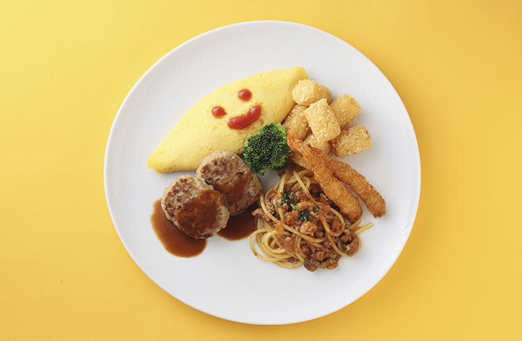 - オムライス、ミートソーススパゲティ、エビフライ、ミニハンバーグ、ハッシュポテト、ブロッコリー