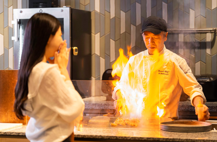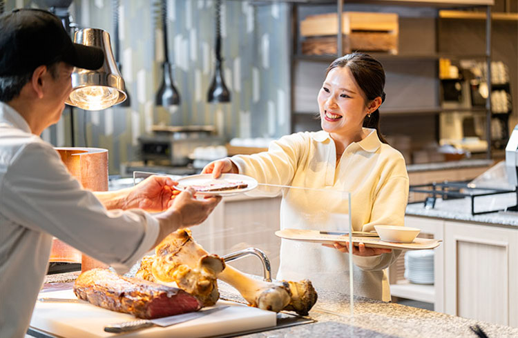 ライブ感あふれるカービングステーションで、シェフが目の前で丁寧にカットするローストビーフは、当店自慢のシグネチャーメニュー。一年を通してお楽しみいただける贅沢な一品です。